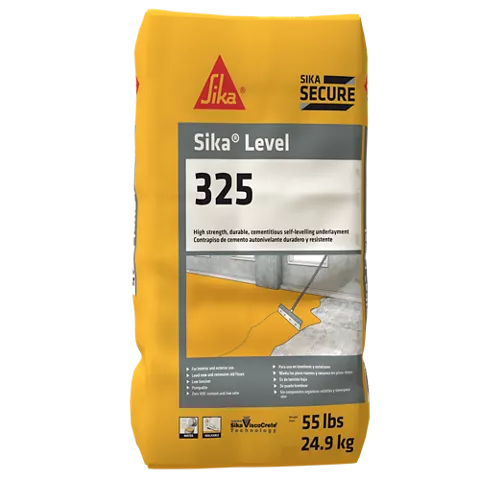 Sika® Level-325 is a one-component, durable and versatile cementitious underlayment for interior and exterior concrete and cementitious substrates. It can be applied manually or by pump to produce a self-smoothing, rapid-setting and flat substrate prior to the application of a final floor finish. Typical application thickness is 1/8” up to 3” (3 mm up to 76 mm).
